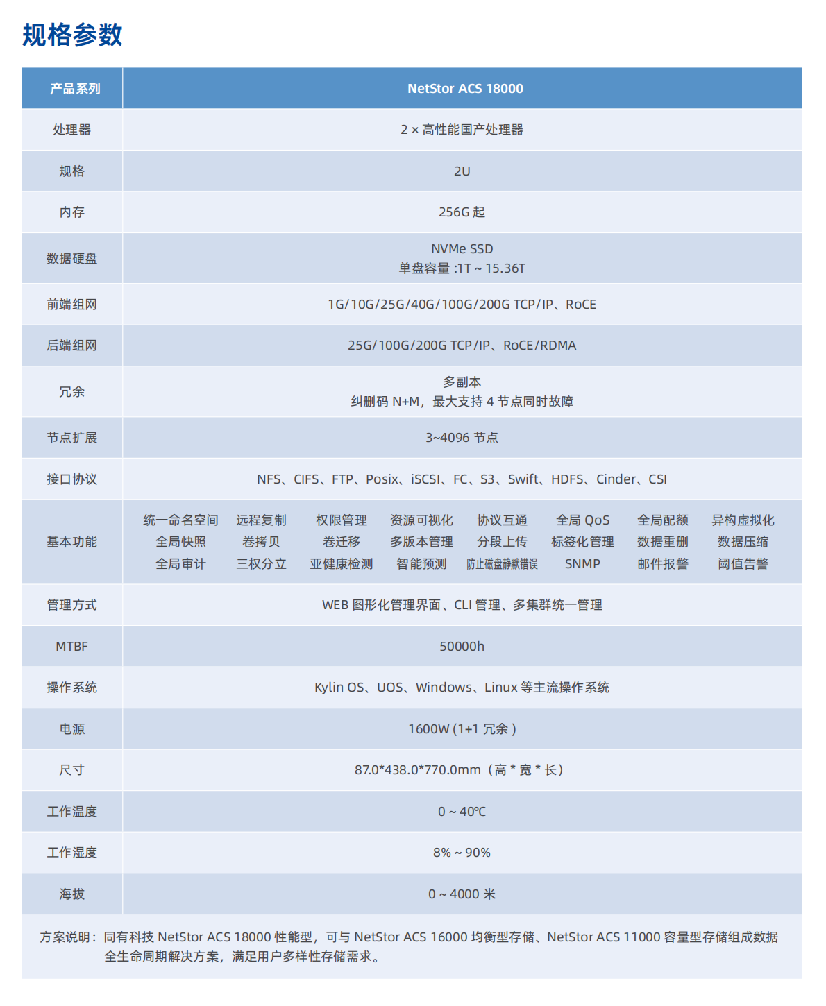 NetStor ACS 18000是基于PCle 5.0的自主可控全闪分布式高端存储产品,在存内计算、系统总线、软件架构、网络协议等方面全面升级,实现了性能代际跨越增长。完全满足AI、大模型、HPC、大数据分析等之前只能靠国外高端产品才能满足的超高性能的核心业务应用需求,彻底解决了长久以来困扰用户的国产存储性能掣肘难题。